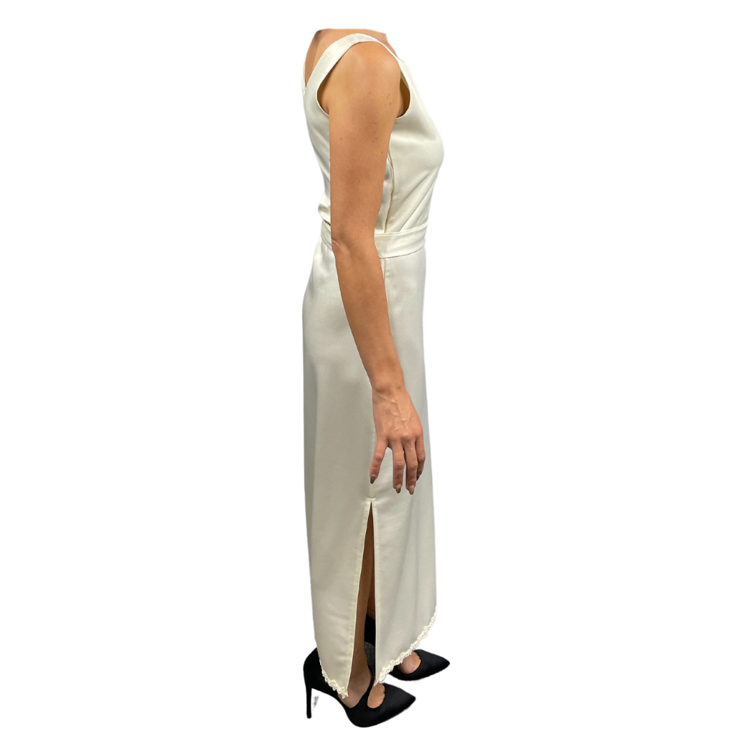 •Lace and oval pearl beads trim the hem